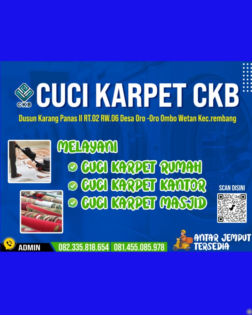 CKB Cuci Karpet Bangil adalah penyedia jasa cuci karpet profesional di Bangil, Beji, dan Rembang Pasuruan yang melayani pencucian berbagai jenis karpet dengan proses pembersihan yang higienis dan hasil yang bersih serta wangi.